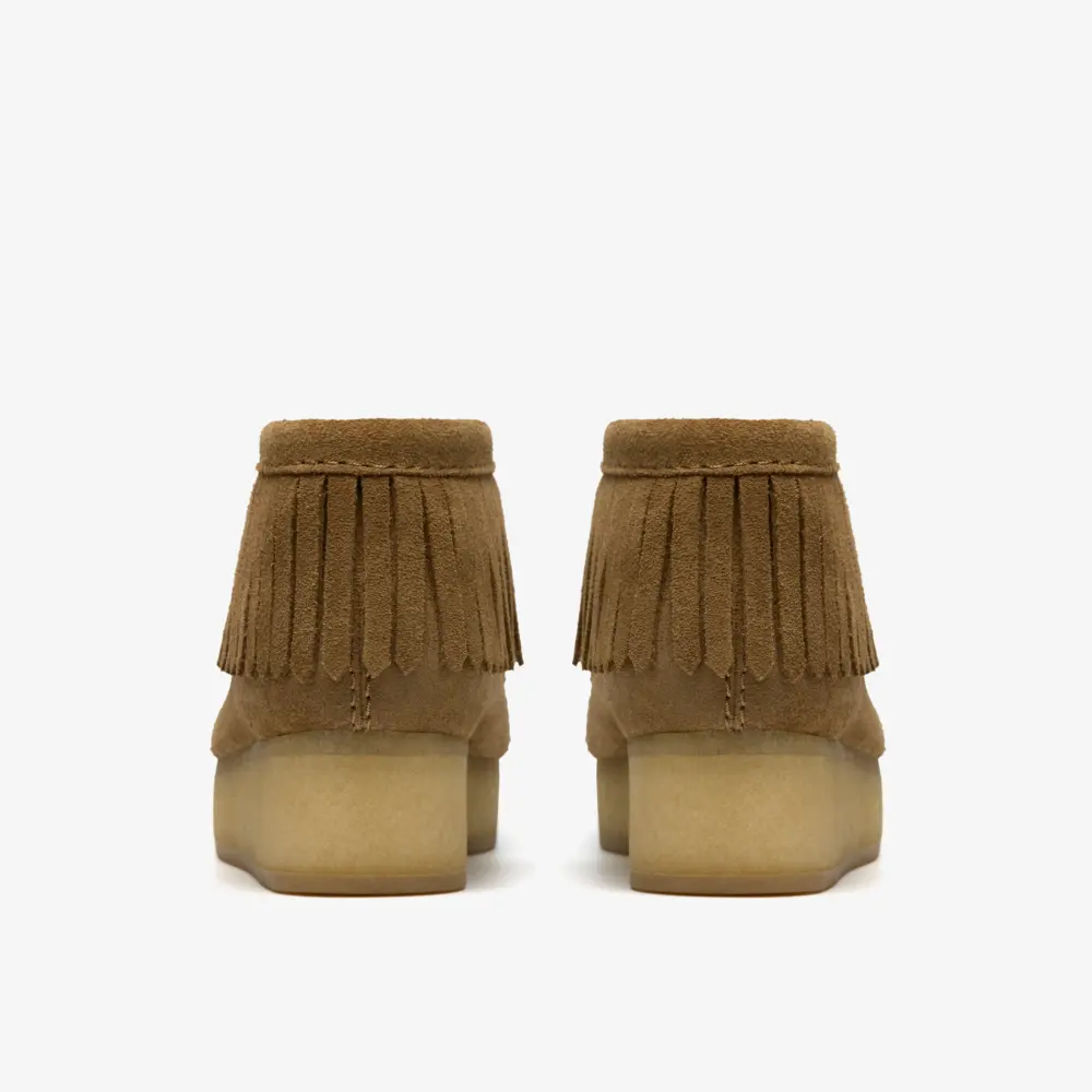 Wir präsentieren den Wallabee™ Wedge Fringe – die perfekte Ergänzung zum Trek Fringe und ein Highlight der AW25 Somerset Nights Kollektion. Diese mittelhohe Stiefelette vereint klassisches Clarks Originals Design mit einem modernen Touch und ist damit ein Must-have der Saison. Erhältlich in hellbraunem Wildleder, besticht der Wallabee™ Wedge Fringe durch seine hochwertige Mokassin-Konstruktion mit handgenähter Saumkante, die höchste Qualität und Langlebigkeit garantiert. Die eleganten, farblich abgestimmten Wildlederfransen verleihen dem Schuh Struktur und Dynamik, während die farblich passende Schnürung mit wunderschönen Perlenverzierungen für einen edlen Touch sorgt. Komfort und Stil vereint dieser Schuh: Die glatte, naturfarbene und schwarze Kreppsohle in Kombination mit der farblich abgestimmten Gummilaufsohle bietet hervorragenden Halt und Stabilität. Zwei unverkennbare Markenzeichen – Clarks Originals und Wallabee™ – unterstreichen Authentizität und Stil.