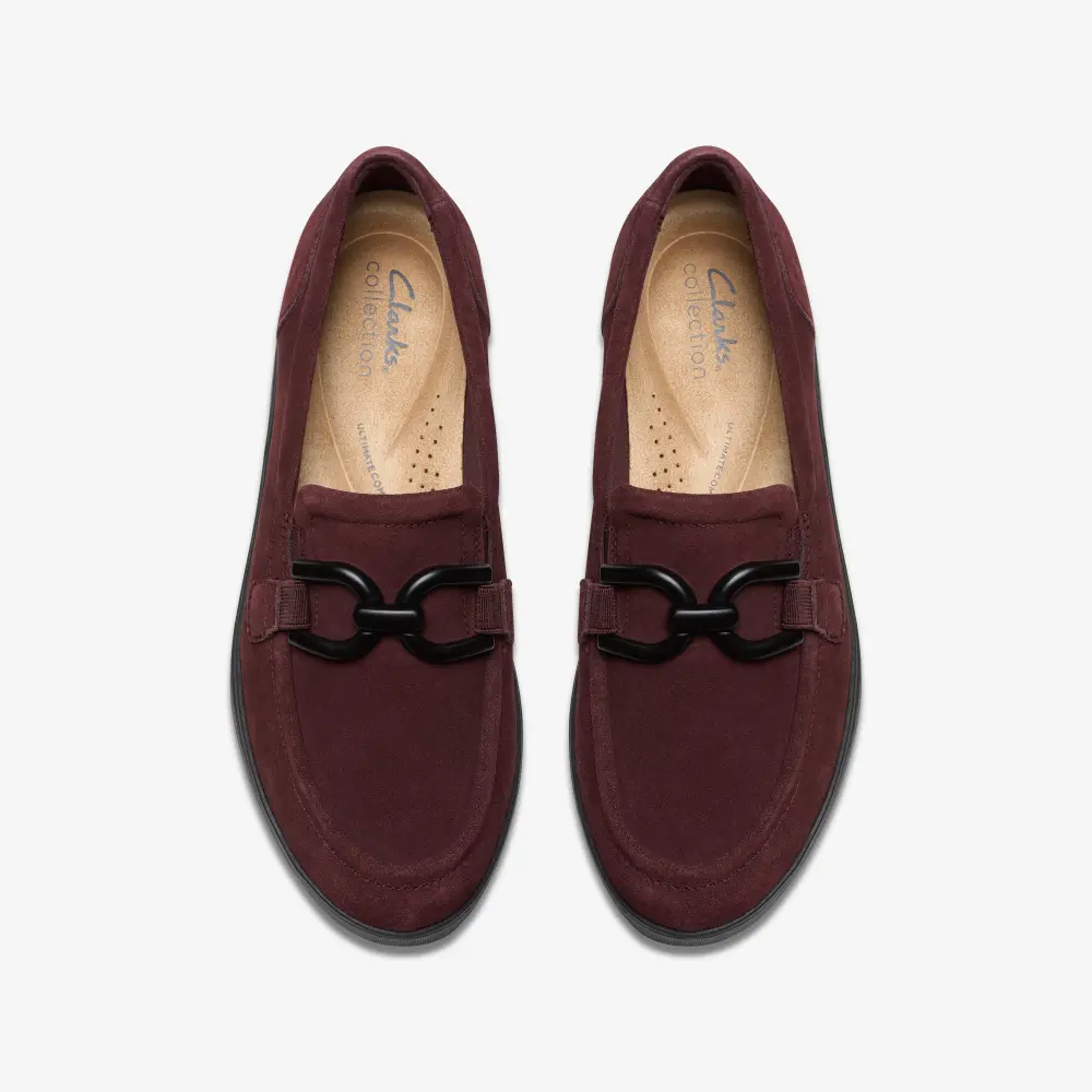- Obermaterial aus hochwertigem, pflaumenfarbenem Wildleder mit Zierelementen vorne